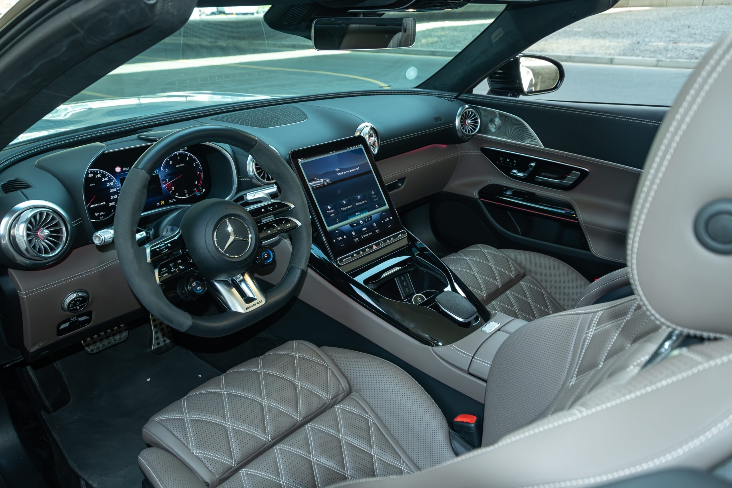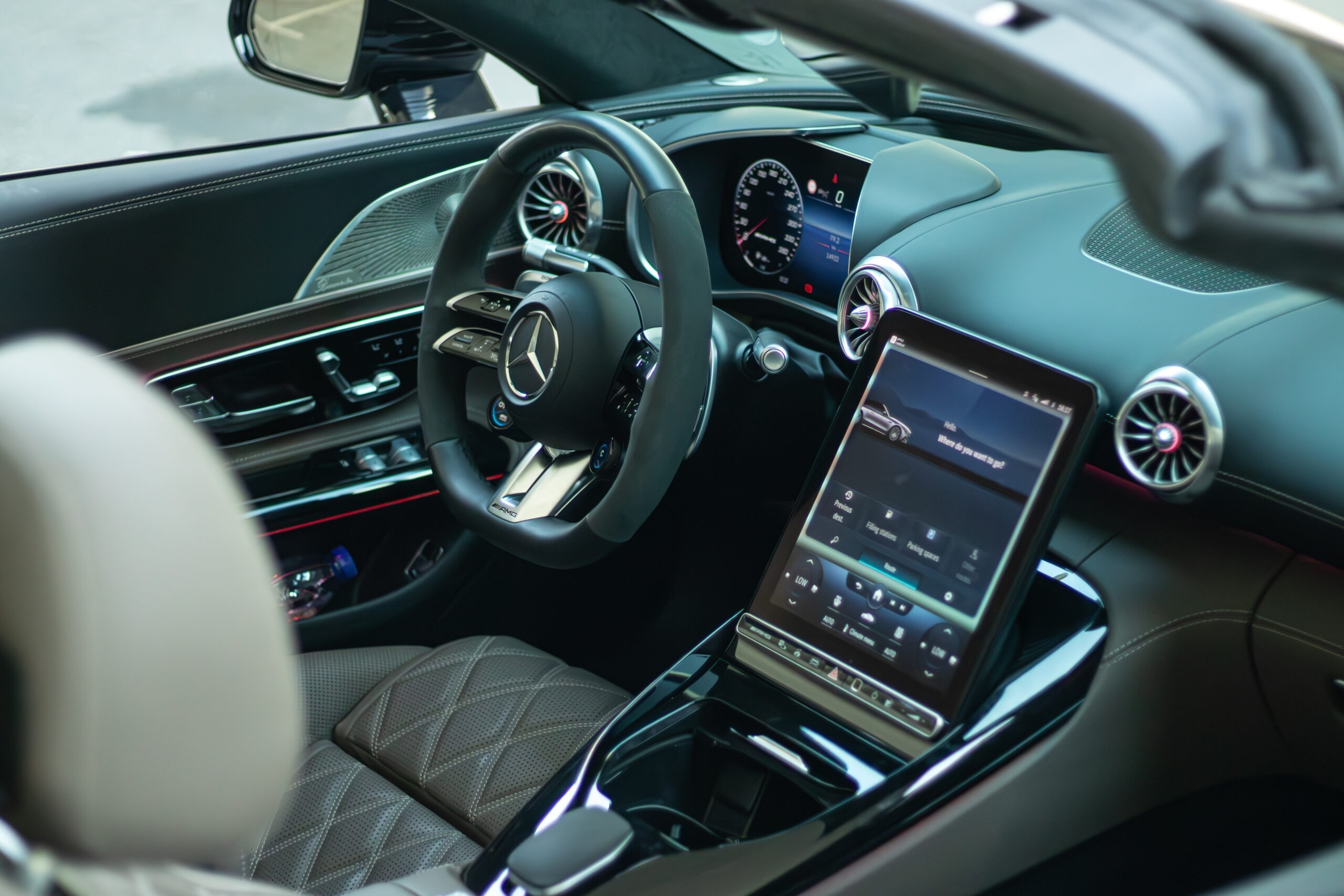 Inside, the SL63 offers a world of comfort and sophistication. The luxurious cabin is crafted with premium materials—Nappa leather seats, carbon fiber trims, and advanced digital displays that blend seamlessly with the classic roadster feel. The retractable soft-top roof opens and closes in seconds, transforming the car from a stylish coupe to a breathtaking open-air cruiser. With advanced features like MBUX infotainment, massaging seats, and ambient lighting, it ensures that every journey is as comfortable as it is exciting.